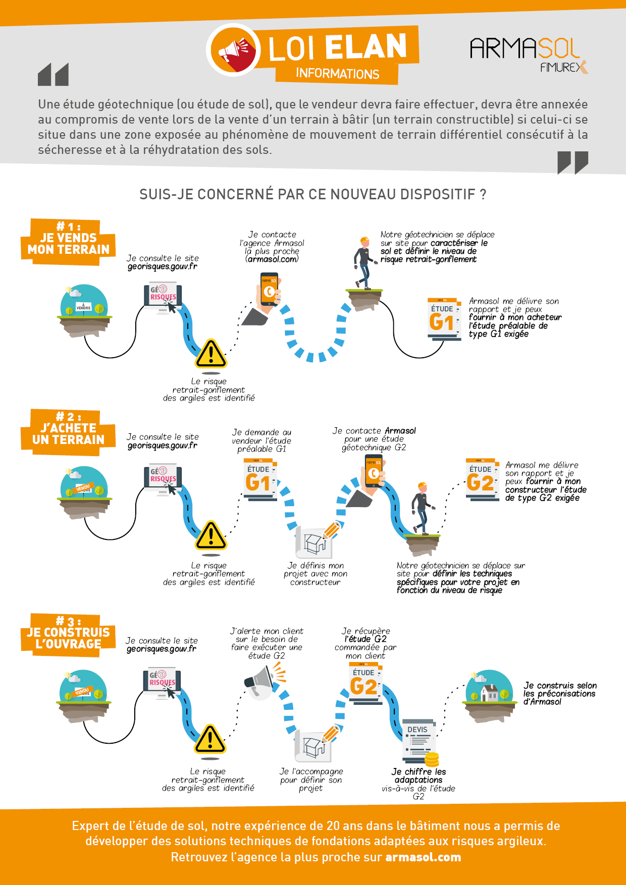 Une étude géotechnique (ou étude de sol), que le vendeur devra faire effectuer, devra être annexée au compromis de vente lors de la vente d'un terrain à bâtir (un terrain constructible) si celui-ci se situe dans une zone exposée au phénomène de mouvement de